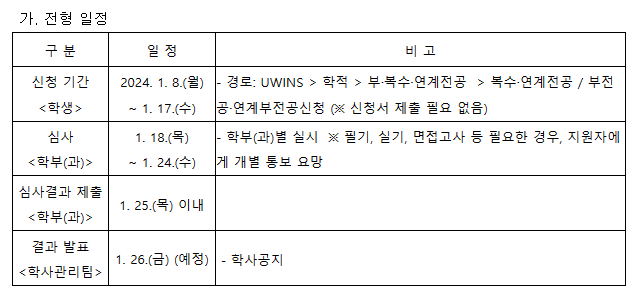 2024-1학기 복수(연계)전공, (연계)부전공 신청 관련 사항을 아래와 같이 안내드리오니 희망하는 학생분들은 기한 내 신청 바랍니다.