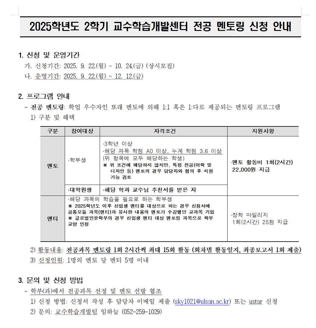 2025-2학기 교수학습개발센터 전공멘토링 지원 및 모집안내 | |||||