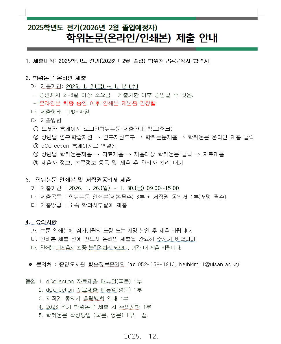 * 학위논문 인쇄본 제출 기간: 2026.1.28 (수) 18:00까지 학부사무실로 제출 * 인쇄본을 모두 취합한 후에 아산도서관(본교)으로 직접 제출해야하므로 기간 연장 불가하오니 양해 부탁드립니다. 또한, 하단에 첨부파일 있으니 꼭 확인해주시 바랍니다.