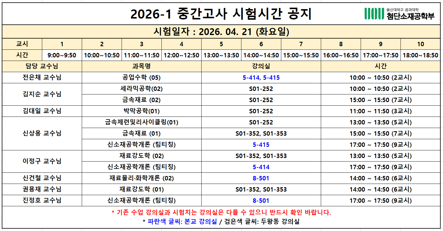 2026-1학기 중간고사 시간표 및 셔틀버스 운행시간표를 안내드리오니 첨부파일 확인하시어 응시 바랍니다.